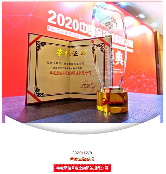 “中國金融機構金牌榜”是《金融時報》自2008年推出的全國性重要金融評選品牌,由中國社會科學院、國家金融與發(fā)展實驗室作為學術支持,并以“金龍獎”冠名,已成為金融界最具權威性、認知度最高的金融評選品牌。今年是“金龍獎”評選的第十三屆,也是西部擔保連續(xù)榮獲該獎項的第五年。面對新冠肺炎疫情的沖擊,隨著國家對融資擔保定位的進一步明確和提出的新要求,西部擔保作為國有擔保機構,擔負起“普惠金融推動者引領者”的使命,增強“轉”的急迫性和“改”的主動性,重點扶持域內(nèi)中小微企業(yè)、民營經(jīng)濟和“三農(nóng)”領域,豐富創(chuàng)新金融產(chǎn)品、服務模式,積極探索科技金融服務多元化,成功推出批量化、標準化的“農(nóng)戶助業(yè)擔”和針對民辦教育、培訓機構的“校易擔”產(chǎn)品,并持續(xù)推進“絨易貸”產(chǎn)品。運用“活牛抵押”擔保模式創(chuàng)新設計推出的特色金融產(chǎn)品“奶企擔”,精準扶持寧夏特色養(yǎng)殖產(chǎn)業(yè),為此榮獲了寧夏“金融服務創(chuàng)新“二等獎。同時,創(chuàng)新推出的“兩票”信用評估模型+“四個維度”評價體系的風險防控新模式,從根本上解決中小微企業(yè)收入驗證難、應收賬款確權難問題,為缺乏抵押物的中小微和“三農(nóng)”企業(yè)提供純信用擔保,使金融服務貫通中小微企業(yè),從根本上解決融資難與貴。