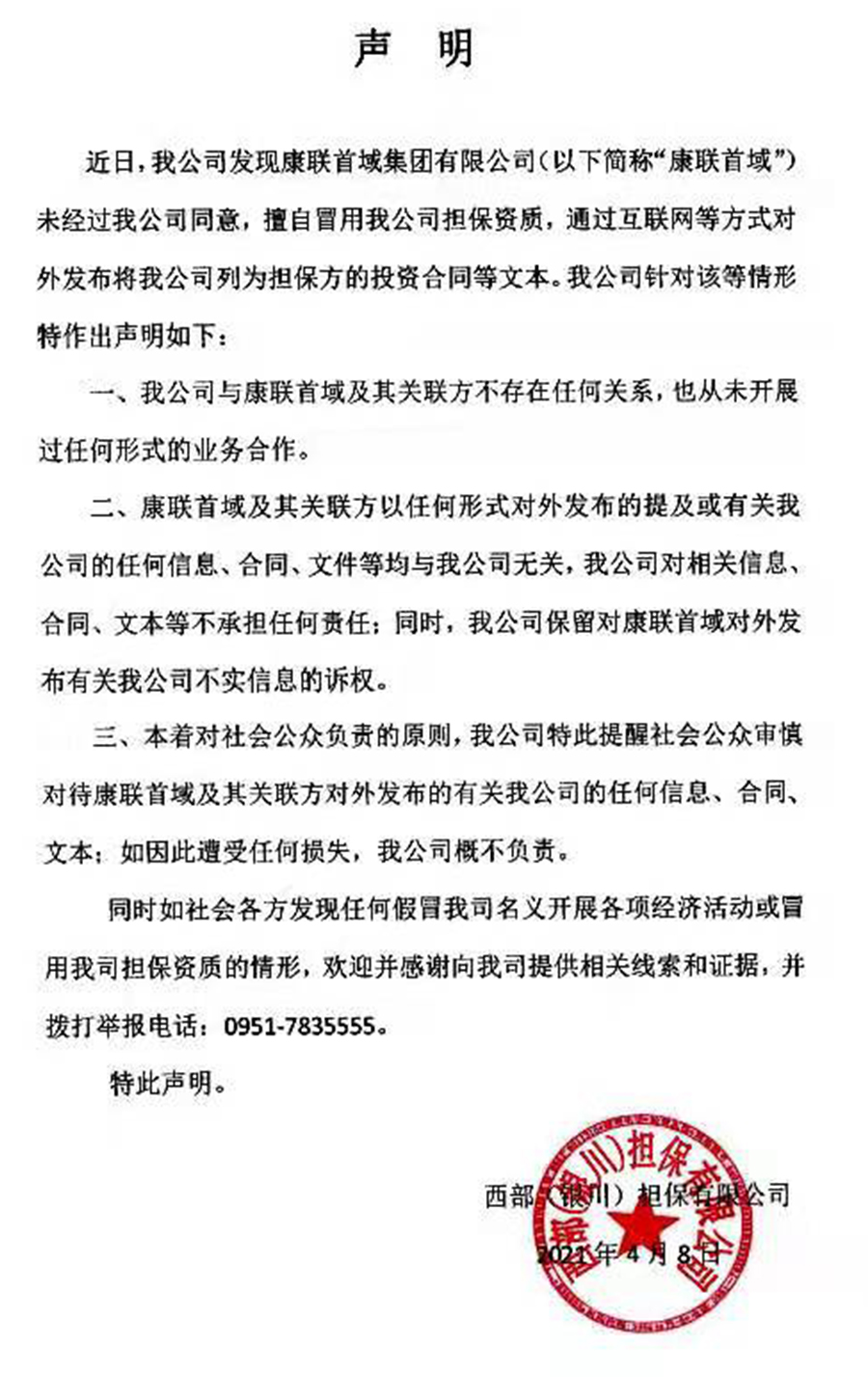 近日,我公司發(fā)現(xiàn)康聯(lián)首域集團有限公司(以下簡稱“康聯(lián)首域”)未經(jīng)過我公司同意,擅自冒用我公司擔保資質(zhì),通過互聯(lián)網(wǎng)等方式對外發(fā)布將我公司列為擔保方的投資合同等文本。我公司針對該等情形特作出聲明如下: