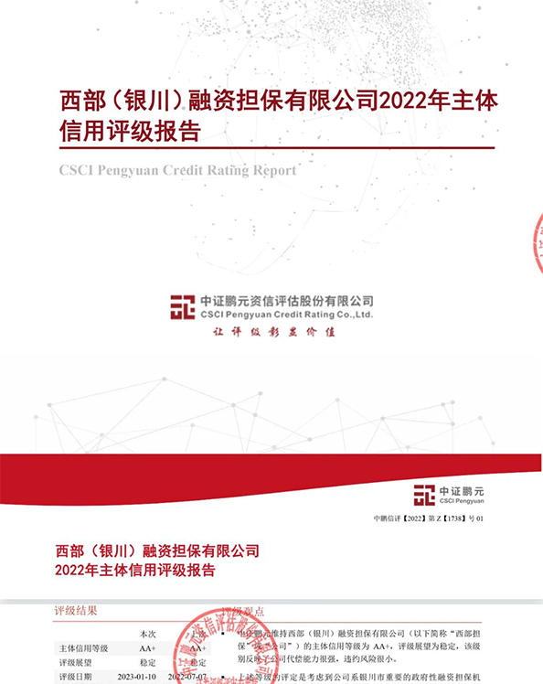 近日,國(guó)內(nèi)權(quán)威信用評(píng)級(jí)機(jī)構(gòu)中證鵬元資信評(píng)估股份有限公司、聯(lián)合資信評(píng)估股份有限公司相繼完成了對(duì)西部擔(dān)保2022年度主體信用評(píng)級(jí)續(xù)評(píng)工作,維持主體信用等級(jí)為“AA+”、評(píng)級(jí)展望為“穩(wěn)定”。