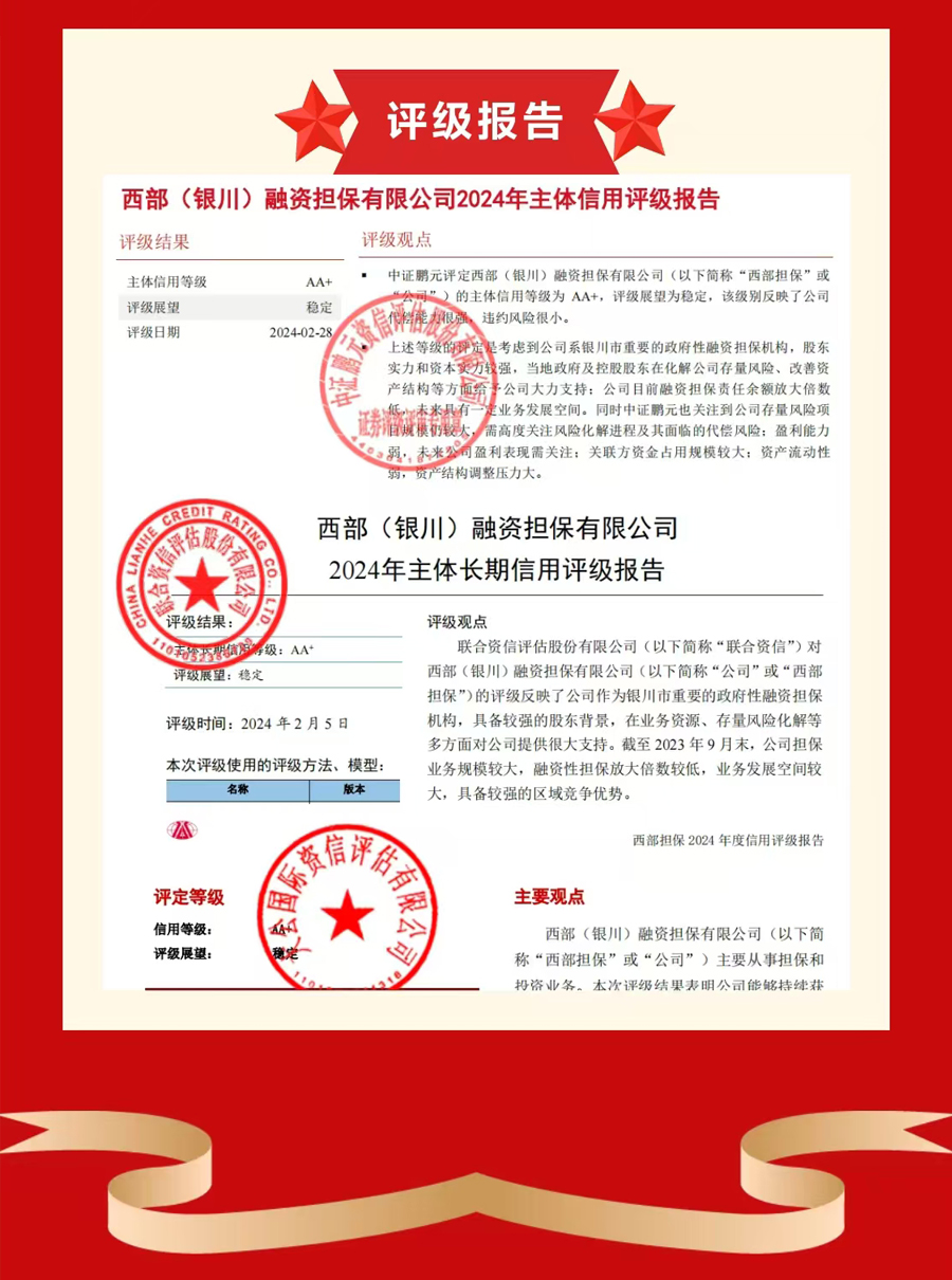 自2024年年初以來,西部(銀川)融資擔保有限公司(以下簡稱“西部擔?!保┫群蠼?jīng)聯(lián)合資信評估股份有限公司、中證鵬元資信評估股份有限公司和大公國際資信評估有限公司三家國內權威評級機構評定,2024年度主體信用跟蹤評級結果均為AA+,評級展望穩(wěn)定。這是西部擔保自2017年首次獲得AA+評級以來,連續(xù)八年獲得AA+主體信用等級,充分彰顯了市場對西部擔保綜合實力及發(fā)展前景的高度認可。