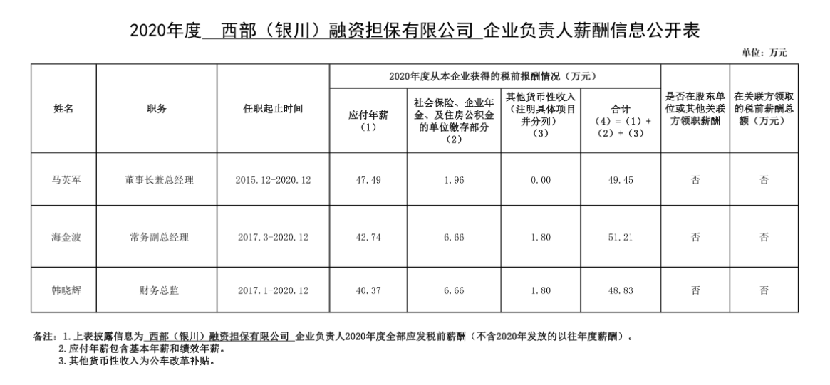 根據(jù)銀川市國資委《關(guān)于做好2019-2020年度企業(yè)負(fù)責(zé)人薪酬信息公開的通知》規(guī)定,經(jīng)審核,現(xiàn)將西部(銀川)融資擔(dān)保有限公司企業(yè)負(fù)責(zé)人2020年度薪酬信息予以公開。