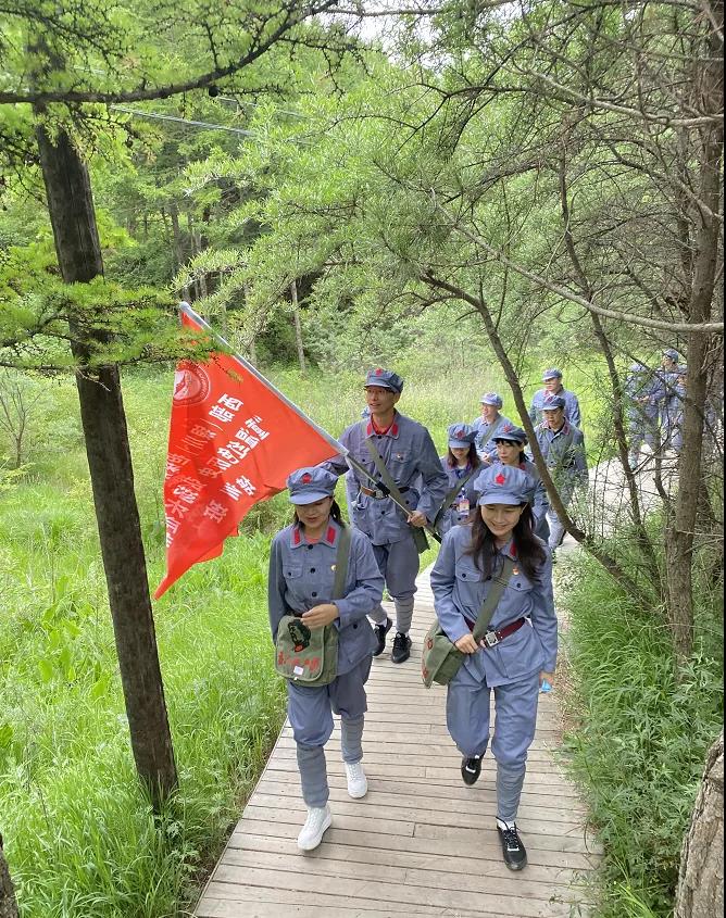 6月19日,全體人員穿上紅軍服,登上六盤山,重走長征小道,沿著小道拾級而上,血戰(zhàn)湘江、遵義會議等紅軍長征途中重要事件復(fù)原場景一一呈現(xiàn)。一步一步向上攀登,用腳步丈量長征征程,用心靈感悟長征精神,大家仿佛親身體驗到了那段艱苦卓絕的偉大征程,更加深刻的體會到革命先烈們不畏艱苦、不怕犧牲的偉大精神。“天高云淡,望斷南飛雁。不到長城非好漢,屈指行程二萬。六盤山上高峰,紅旗漫卷西風(fēng)。今日長纓在手,何時縛住蒼龍?”登上六盤高峰,心念這首詞,更能深刻地感受到毛澤東同志翻越六盤山時的詠懷之情。