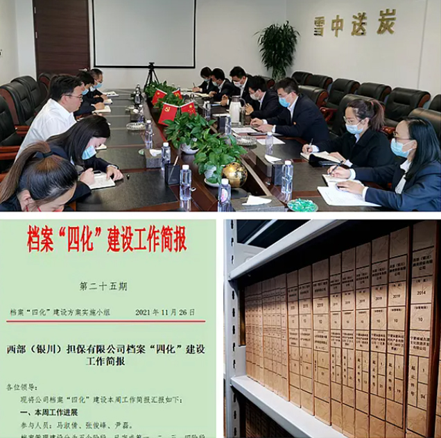 檔案是金融企業(yè)在業(yè)務(wù)辦理及服務(wù)活動(dòng)中形成并具有保存價(jià)值的載體記錄,在防控金融風(fēng)險(xiǎn)方面發(fā)揮著極其重要的作用。為進(jìn)一步強(qiáng)化公司風(fēng)險(xiǎn)管理水平,完善內(nèi)控制度、規(guī)范檔案管理工作,西部擔(dān)保秉持“對(duì)歷史負(fù)責(zé),為現(xiàn)實(shí)服務(wù),替未來(lái)著想”的建設(shè)理念,組織開(kāi)展了檔案管理“四化”建設(shè)行動(dòng),以“軟硬件”同步實(shí)施為抓手,形成了“收集-整理-歸檔-保護(hù)-利用”全流程專(zhuān)業(yè)化的檔案資源體系,努力實(shí)現(xiàn)檔案管理的“規(guī)范化、標(biāo)準(zhǔn)化、整體化、統(tǒng)一化”的四化目標(biāo),目前已取得了階段性成果。