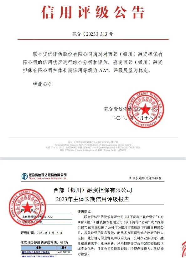 近日,國(guó)內(nèi)權(quán)威信用評(píng)級(jí)機(jī)構(gòu)中證鵬元資信評(píng)估股份有限公司、聯(lián)合資信評(píng)估股份有限公司相繼完成了對(duì)西部擔(dān)保2022年度主體信用評(píng)級(jí)續(xù)評(píng)工作,維持主體信用等級(jí)為“AA+”、評(píng)級(jí)展望為“穩(wěn)定”。