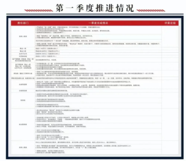 一季度,“作戰(zhàn)圖”的6類重點(diǎn)任務(wù)中,各部門(mén)、各小組對(duì)標(biāo)對(duì)表,業(yè)務(wù)收入目標(biāo)、全面風(fēng)險(xiǎn)管理提升、公司重組推進(jìn)等目前都已取得階段性進(jìn)展。大家始終把習(xí)近平總書(shū)記提出的“掌握情況要細(xì),分析問(wèn)題要細(xì),制定方案要細(xì),配套措施要細(xì),工作落實(shí)要細(xì)”的“五細(xì)”作風(fēng)要求貫穿掛圖作戰(zhàn)全過(guò)程,突出“精細(xì)管理”,讓進(jìn)度鎖定在每個(gè)步驟節(jié)點(diǎn),將全年重點(diǎn)工作“全景”和規(guī)劃掛上墻、裝進(jìn)心。通過(guò)分層推進(jìn)、分類施策,進(jìn)一步壓緊壓實(shí)責(zé)任鏈條,確保工作任務(wù)和責(zé)任落實(shí)環(huán)環(huán)相扣,閉環(huán)推進(jìn)。通過(guò)綜合管理部對(duì)重點(diǎn)任務(wù)的實(shí)時(shí)追蹤督辦,按時(shí)間節(jié)點(diǎn)要求,逐項(xiàng)標(biāo)明工作進(jìn)展情況,隨時(shí)掌握工作進(jìn)度、完成情況及難點(diǎn)堵點(diǎn)問(wèn)題,以“實(shí)施步驟清單化、工作進(jìn)度可視化”的方式,對(duì)重點(diǎn)工作推進(jìn)質(zhì)量一目了然、心中有數(shù),確保各項(xiàng)工作任務(wù)高效率推進(jìn)、高質(zhì)量落實(shí)。
