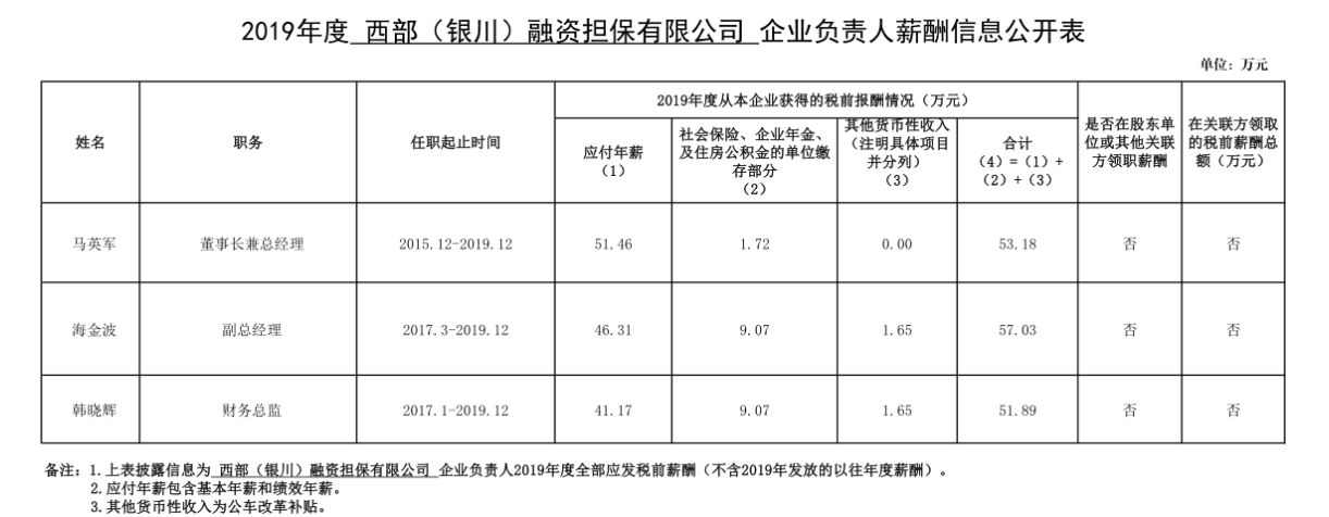 根據(jù)銀川市國(guó)資委《關(guān)于做好2019-2020年度企業(yè)負(fù)責(zé)人薪酬信息公開的通知》規(guī)定,經(jīng)審核,現(xiàn)將西部(銀川)融資擔(dān)保有限公司企業(yè)負(fù)責(zé)人2019年度薪酬信息予以公開。